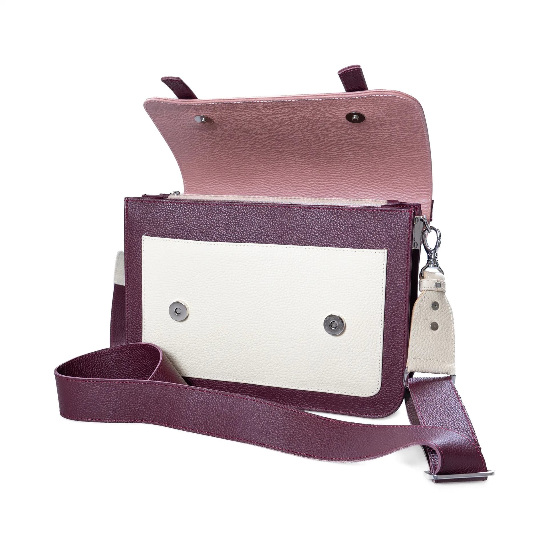 Ima pregradu u sredini i džep sa rajsvešlusom unutra, kao i džep pozadi za telefon. Takođe, poseduje podesiv kaiš za nošenje preko ramena ili cross body nošenje, a mašna je ukloniva.
